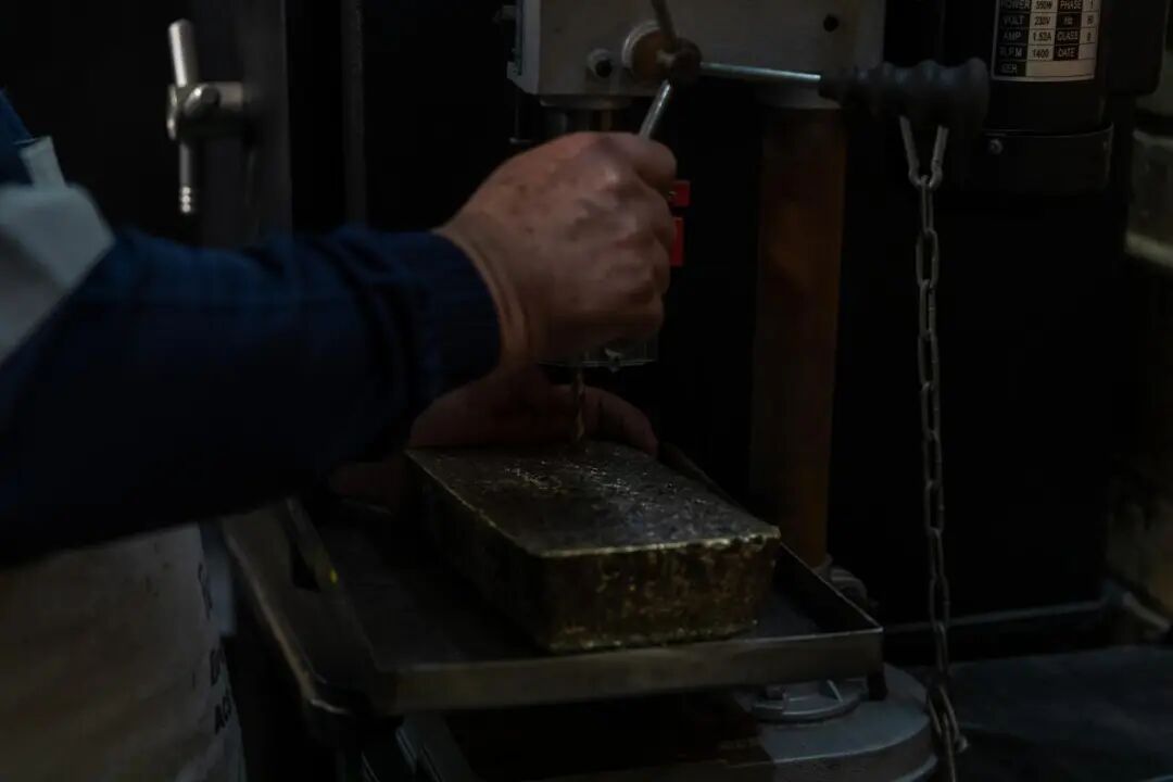 登上十?dāng)?shù)米的設(shè)備平臺,巨大的磨機(jī)轟隆作響,礦石在鋼球的攪動(dòng)下變成粉末,與選礦劑混合,變成礦漿進(jìn)入冶金車間。隨后,通紅的液體在坩堝里沸騰,閘口一開,如同巖漿般流入模具,很快,一塊重達(dá)26.4千克、純度為88%的金錠誕生了。