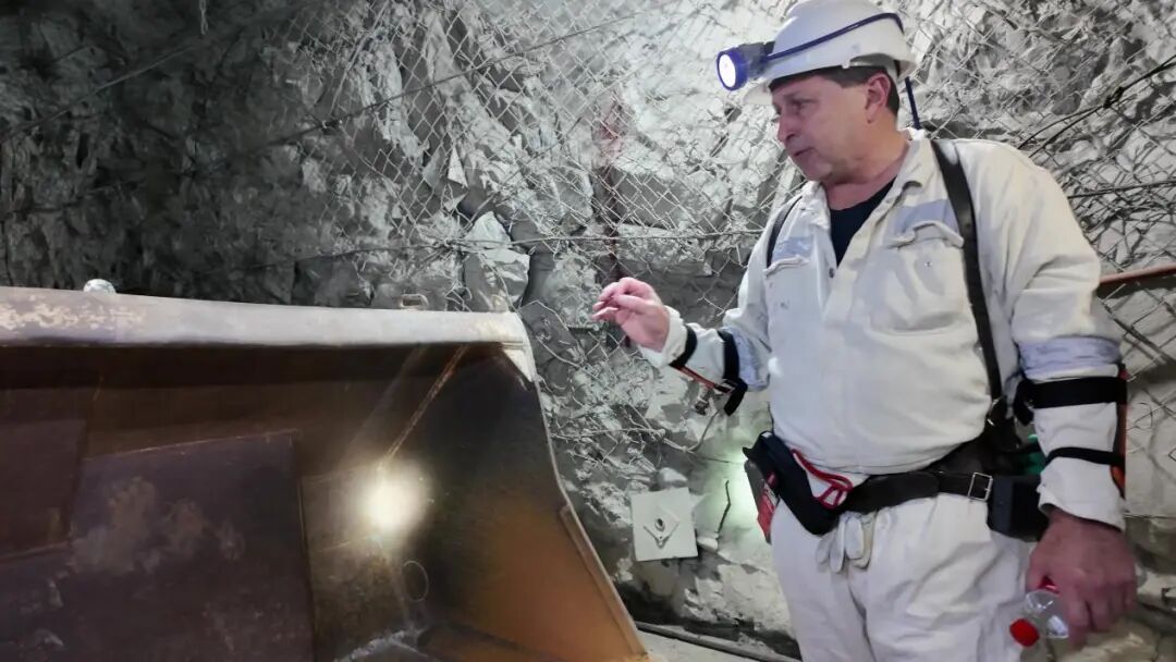 (沃倫·弗里瑪在井下向記者講述礦石運(yùn)輸流程)